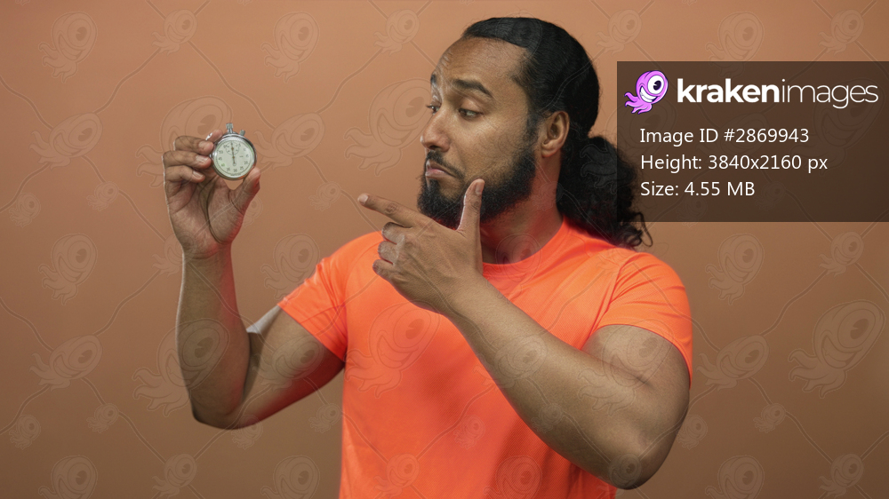 Man in bright orange shirt holds stopwatch in hand and studies the dial in studio with brown backdrop; focus urgency timekeeping.