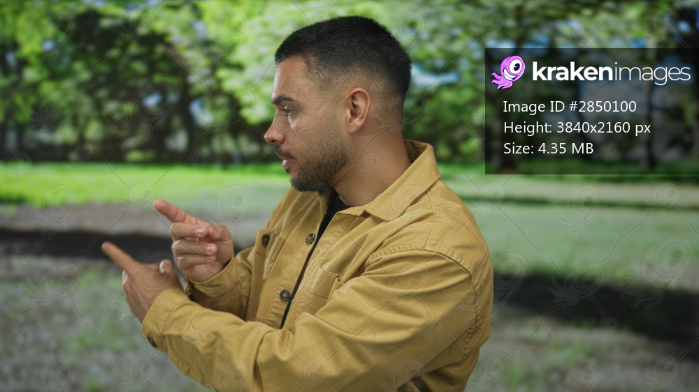 Man in brown jacket points fingers toward a sunlit trail amid leafy trees in green forest; determination choice.