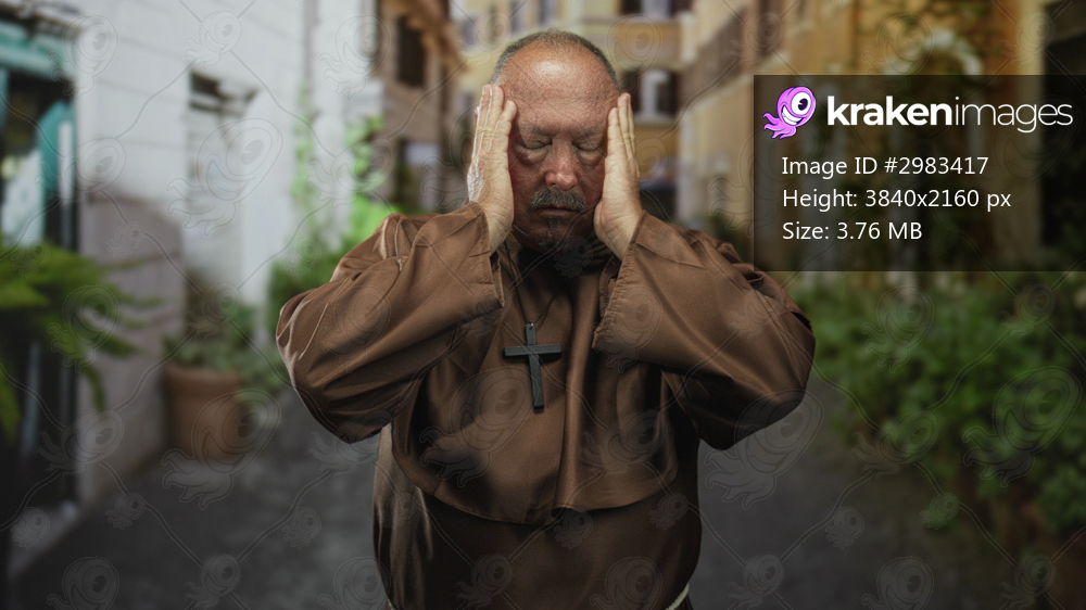 Man in brown monk robe presses hands to head with cross pendant visible on a narrow street; distress faith.