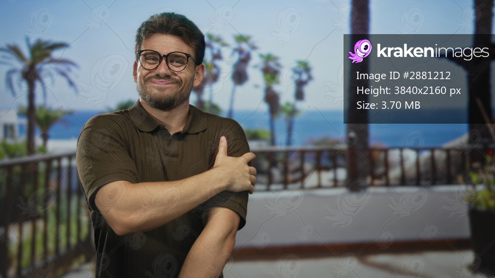 Man in brown polo shirt holds and rubs bare forearm on building balcony overlooking palm trees and ocean; discomfort seaside scene.