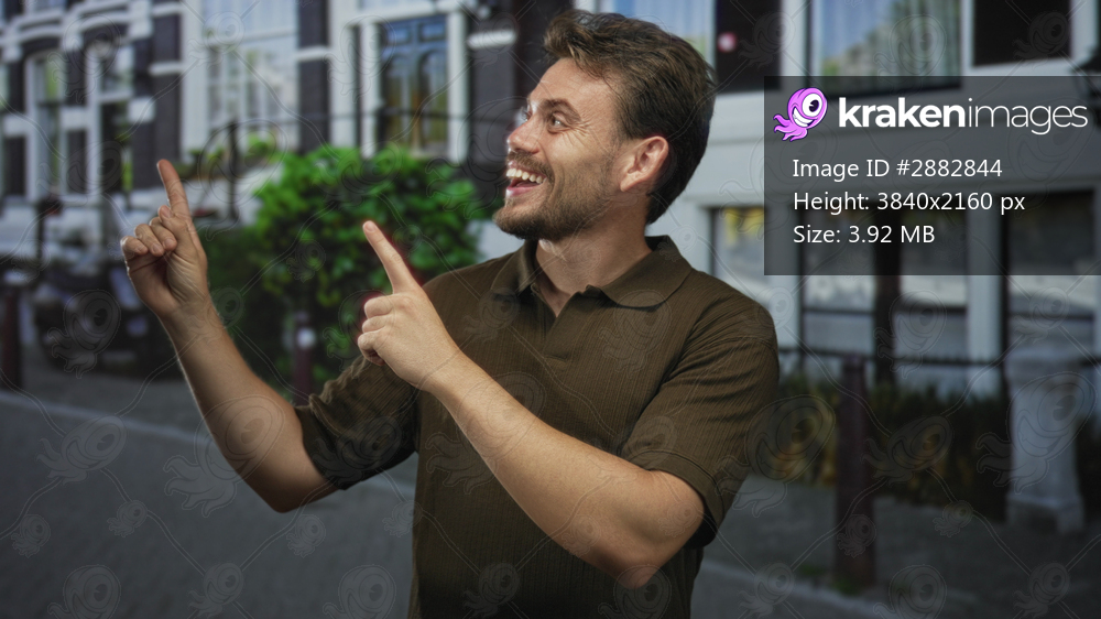 Man in brown polo shirt pointing with fingers and smiling on a cobbled street in front of a white building with windows; friendly inviting joyful.