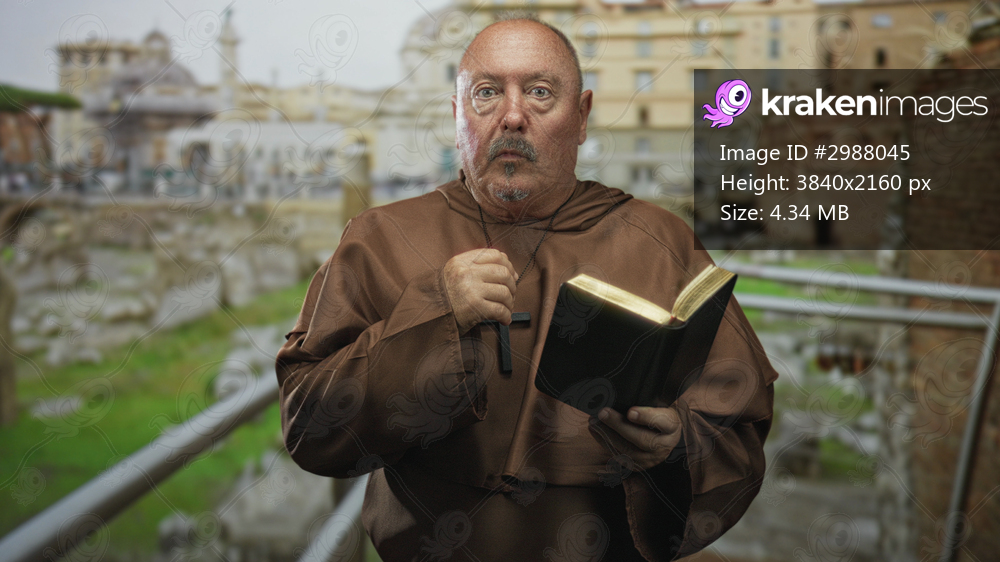 Man in brown robe holds open bible and clutches wooden cross on building walkway, hand raised to chest in startled gesture; devotion surprise.