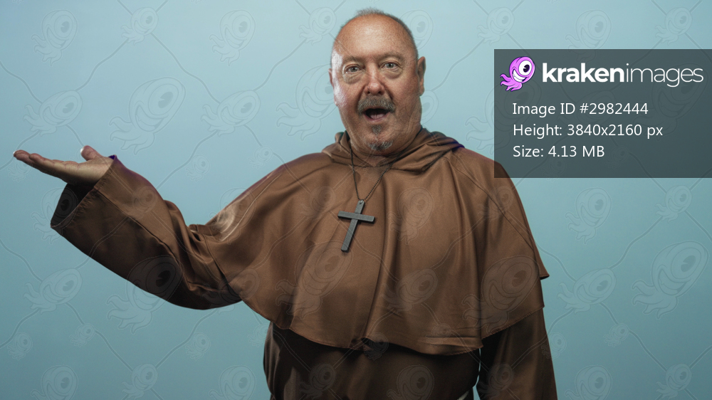 Man in brown robe holds out open palm gesture while facing left and speaking in studio; surprise wonder.