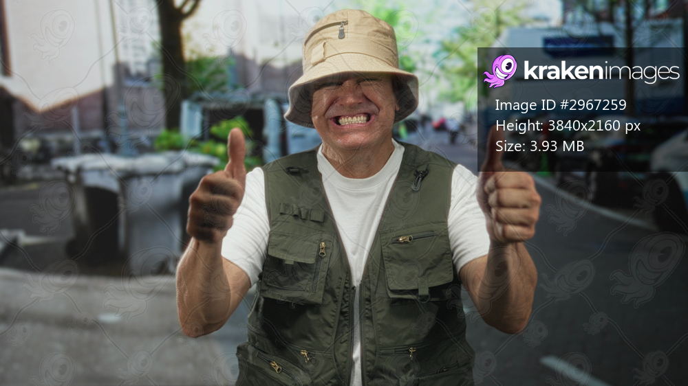 Man in bucket hat and green fishing vest bares forearms and gives double thumbs up while smiling on a street lined with parked cars and trash bins; optimism resilience. - Kraken Images