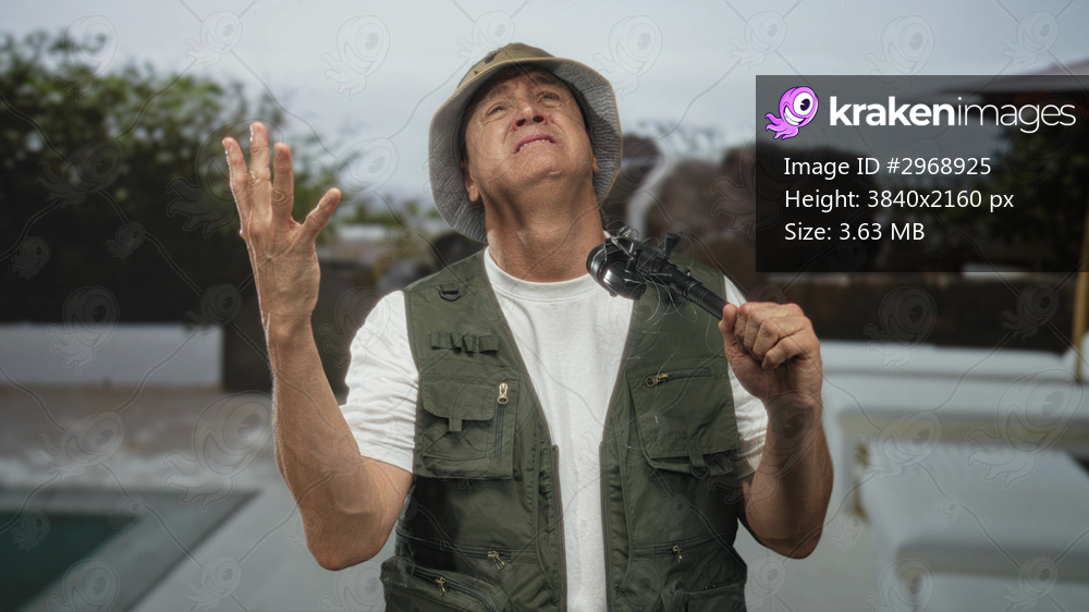 Man in bucket hat holds fishing rod and reel with arms crossed and grimacing, fishing vest visible on pool deck by lounge chairs; frustration.
