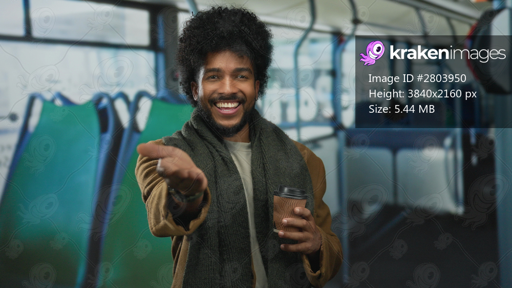 Man in bus extends hand with smile, holding coffee, showcasing friendly gesture indoors.