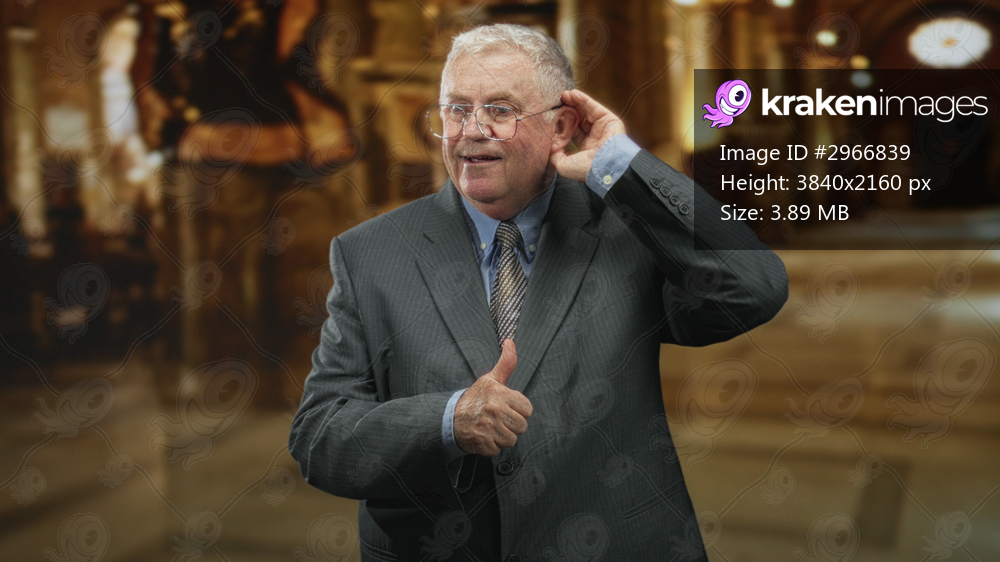 Man in business suit with glasses and gray hair gives thumbs up and cups ear in a marble building lobby with ornate columns; curious listening.