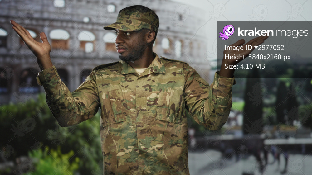 Man in camouflage military uniform and cap touches chin with hand while standing before a historic building; pride duty.