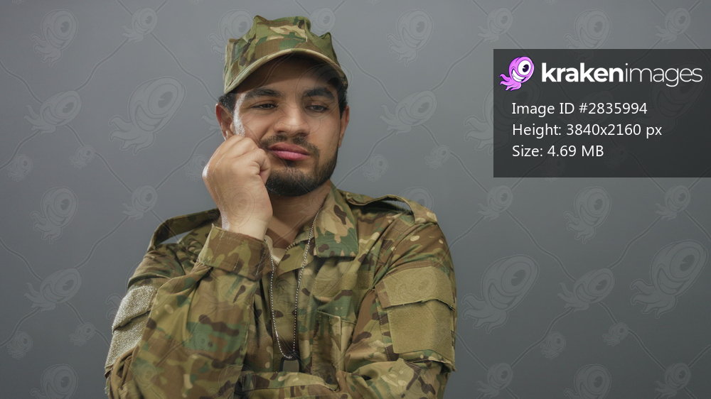Man in camouflage military uniform with dogtags holds hand to chin against gray backdrop in studio; contemplation.