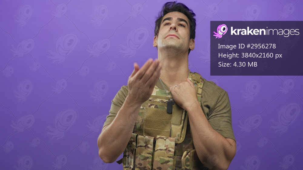 Man in camouflage plate carrier touches dog tags at neck and tilts head back against purple studio wall; pride duty resolve.