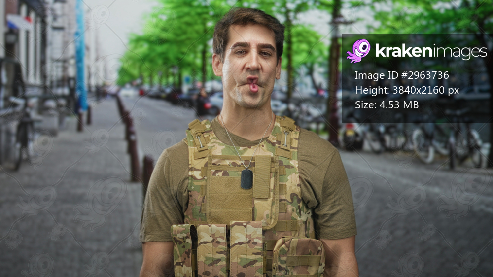 Man in camouflage tactical vest and dog tags, soldier twisting tongue and turning his head on a tree lined street with bicycles visible; playful resilience. - Kraken Images