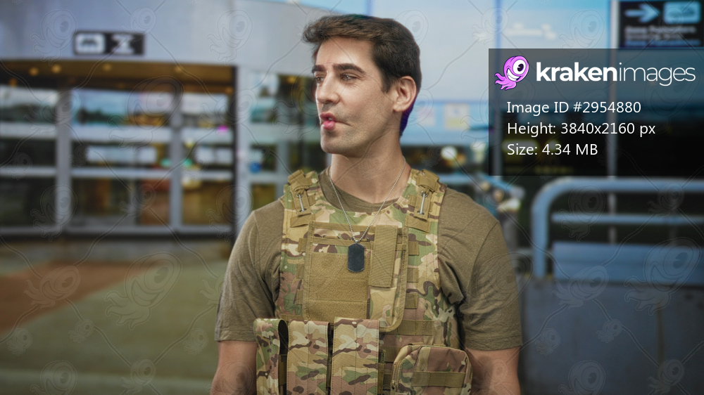 Man in camouflage tactical vest with dog tags standing at airport entrance purses lips to the side while facing camera; pride resolve.
