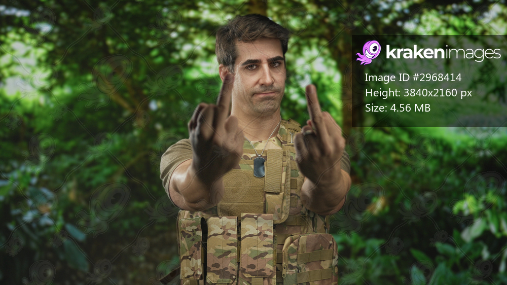 Man in camouflage tactical vest shows both middle fingers, dog tags visible, standing in forest; defiance protest.