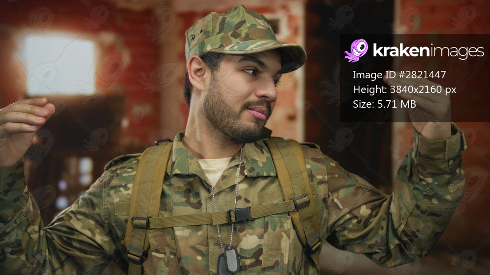 Man in camouflage uniform with backpack and dog tags raises both hands inside a brick building; duty focus discipline readiness.