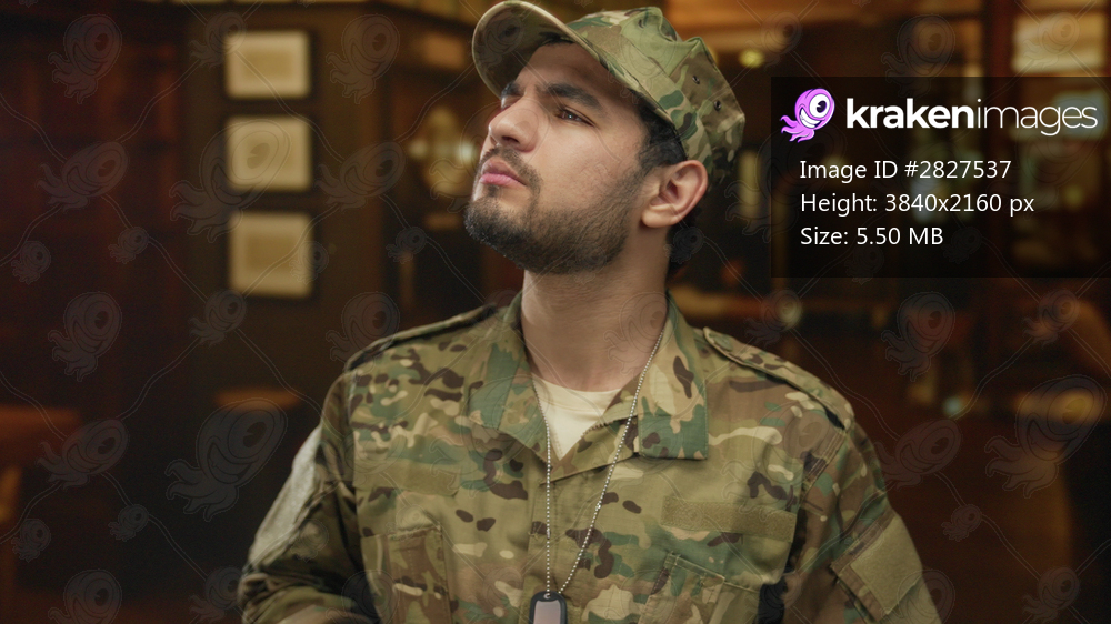 Man in camouflage uniform and cap with dogtags stands in dim hotel building lobby looking upward; duty.