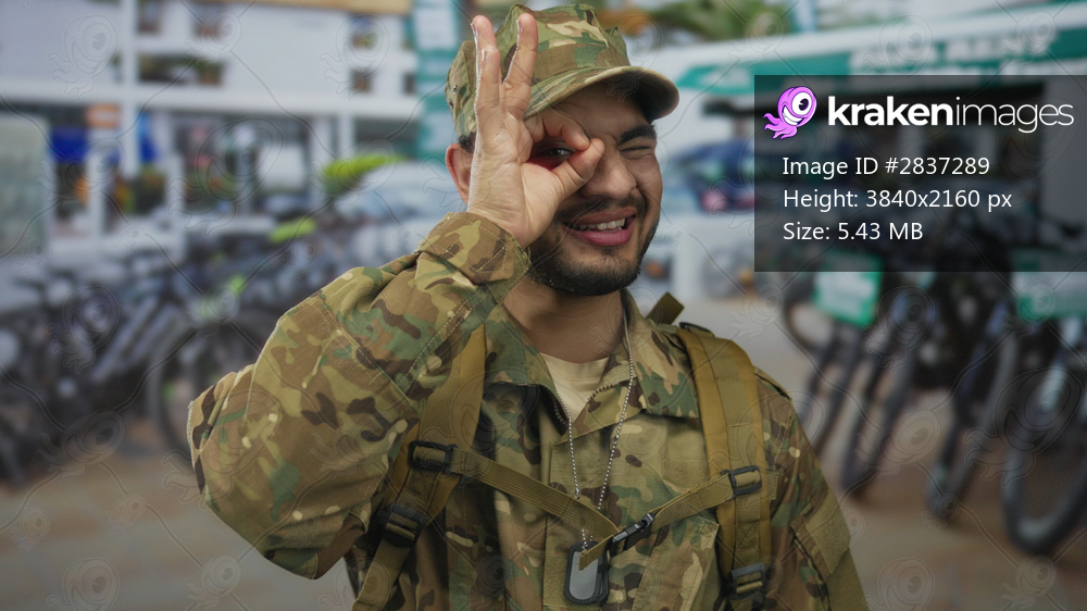 Man in camouflage uniform with dog tags makes ok sign next to rows of bike rental stands on street; approval.