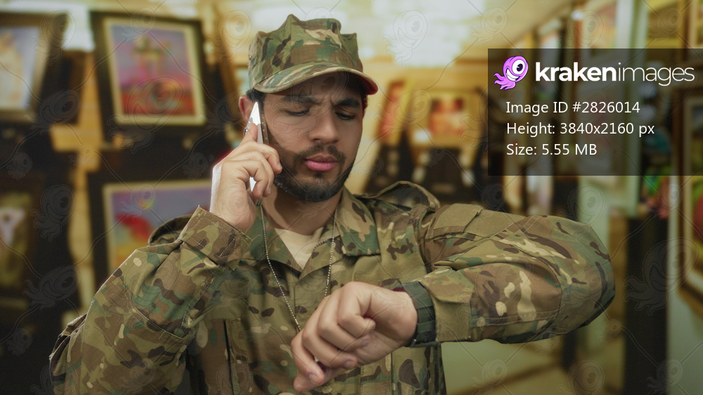 Man in camouflage uniform holding phone to ear checks wristwatch in building lined with paintings; urgency.