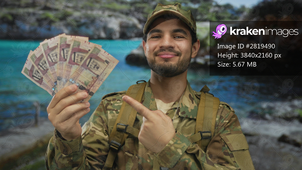 Man in camouflage uniform points finger and smiles at fan of saudi riyal banknotes at street; pride reward.