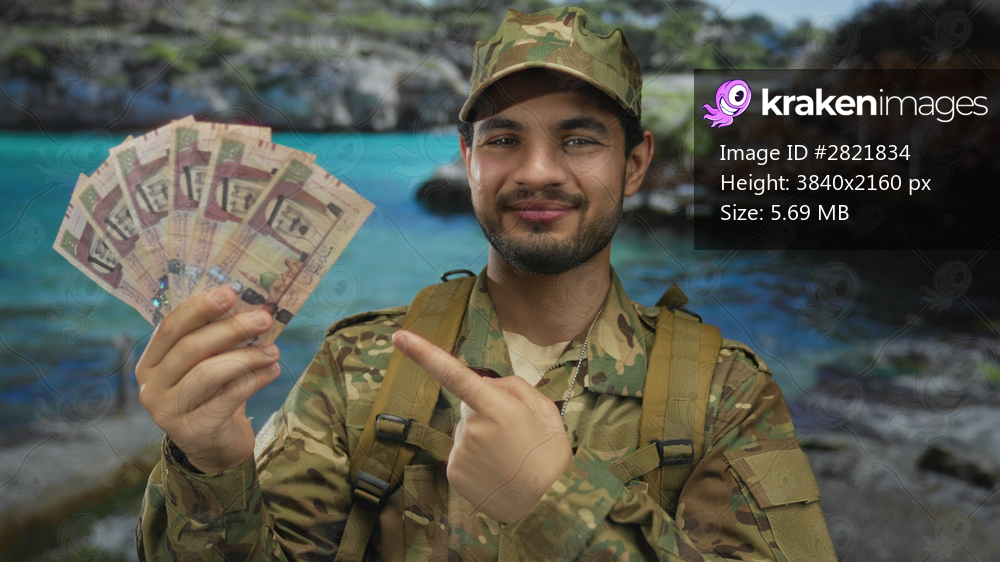 Man in camouflage uniform points finger and smiles at fan of saudi riyal banknotes at street; pride reward.