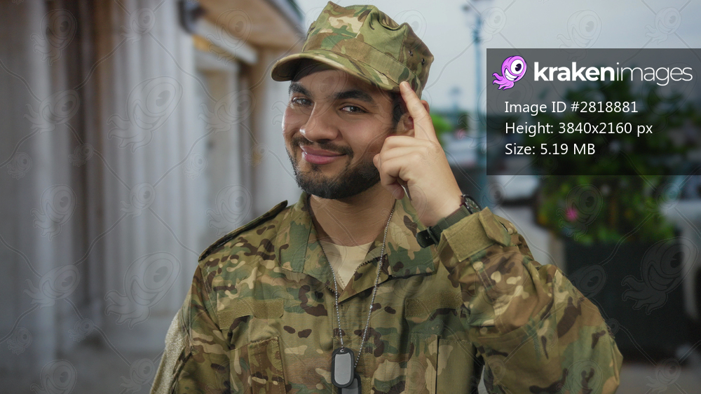 Man in camouflage uniform points finger to temple on urban street with dog tags visible; confidence.