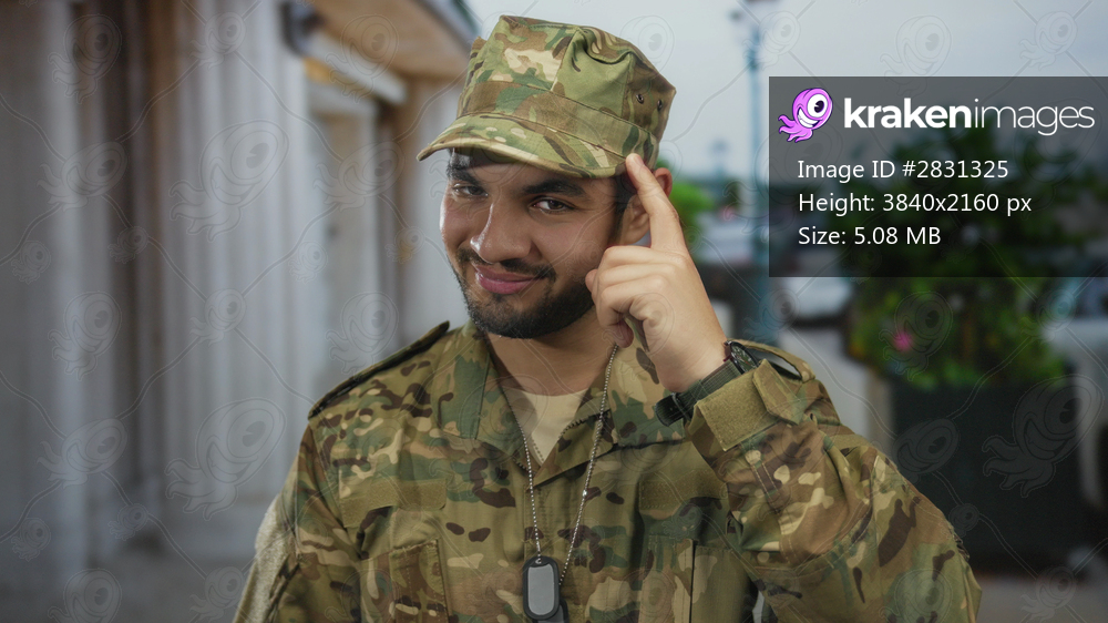 Man in camouflage uniform points finger to temple on urban street with dog tags visible; confidence.