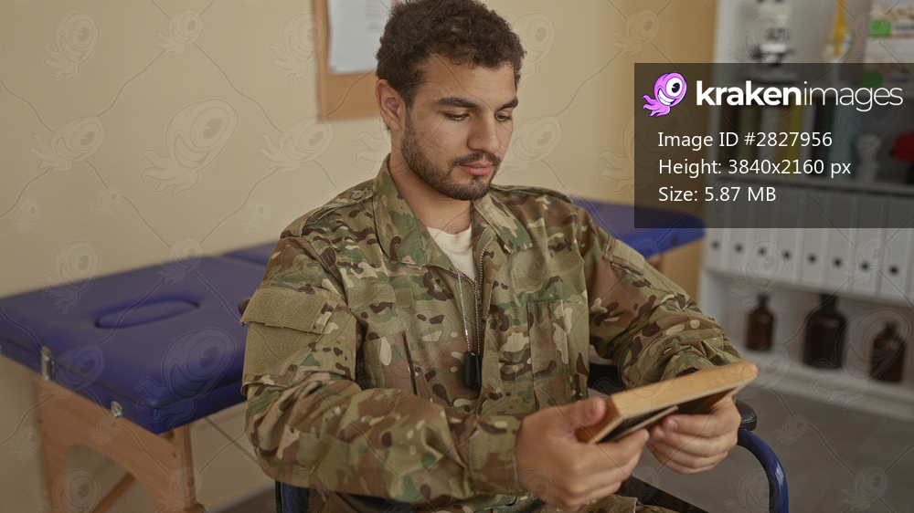 Man in camouflage uniform seated in wheelchair holds wooden picture frame beside medical table in building; healing journey.