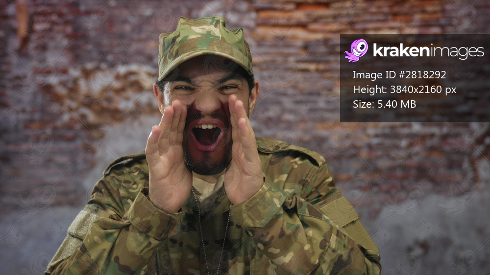 Man in camouflage uniform shouting with hand cupped at mouth against a brick wall inside a building; urgency.