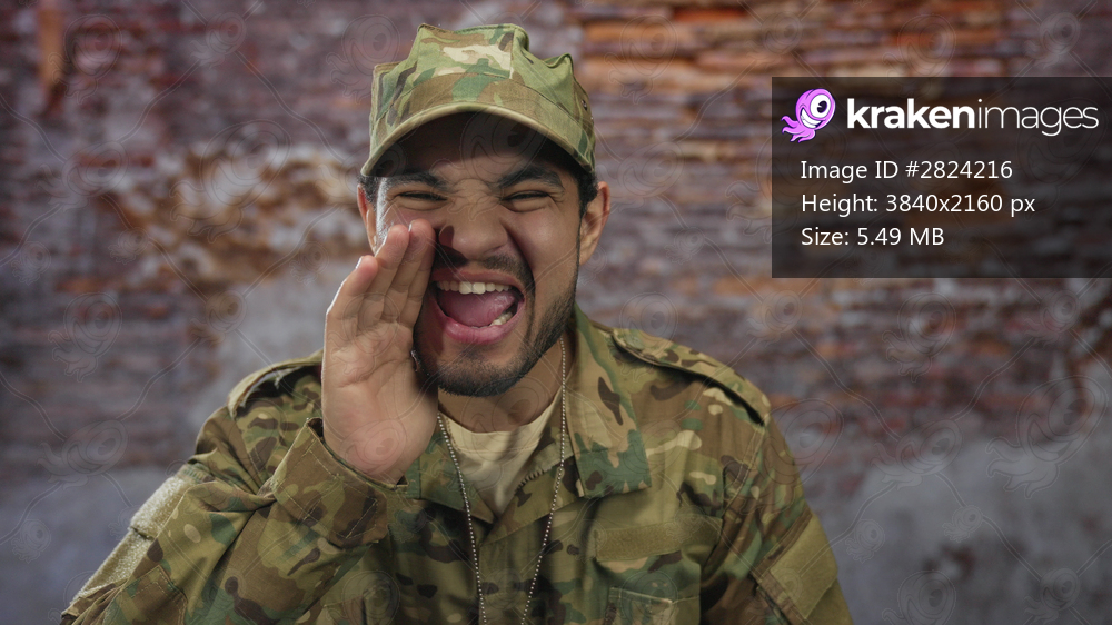Man in camouflage uniform shouting with hand cupped at mouth against a brick wall inside a building; urgency.