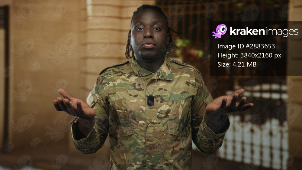 Man in camouflage uniform stands with closed eyes, showing dog tags and open hands at building entrance; duty resilience.