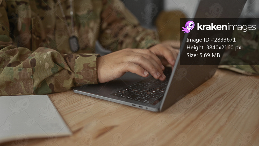 Man in camouflage uniform typing on laptop with hands on wood desk, dogtag visible, indoor setting in building; duty focus.