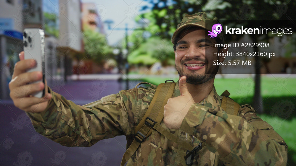 Man in camouflage uniform wearing backpack takes selfie with smartphone on city street; pride service.