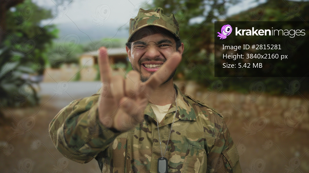 Man in camouflage uniform wearing dog tag chain makes rock horns gesture on old town street beside stone building facade; fun energy.