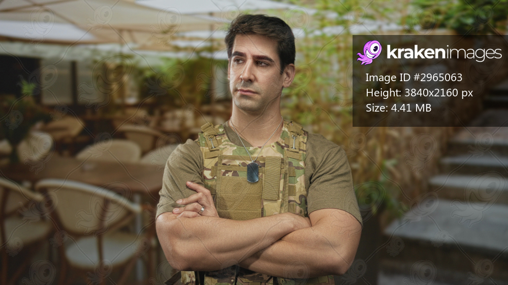 Man in camouflage vest with crossed arms, visible dog tags and wedding ring, eyes closed at outdoor cafe patio; determination.