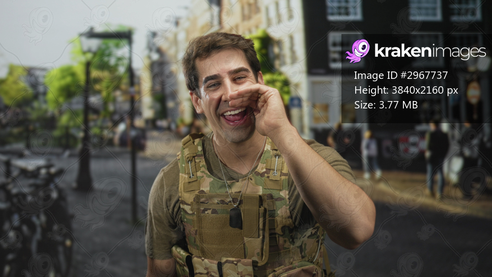 Man in camouflage vest with dog tags cups hand to mouth calling and laughing on a busy cobblestone street; pride duty.