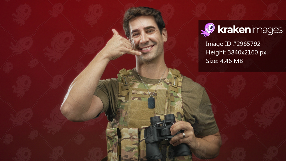 Man in camouflage vest holding binoculars with hand forming call gesture in studio, smiling with dogtags visible and tactical vest details; playful confidence. - Kraken Images