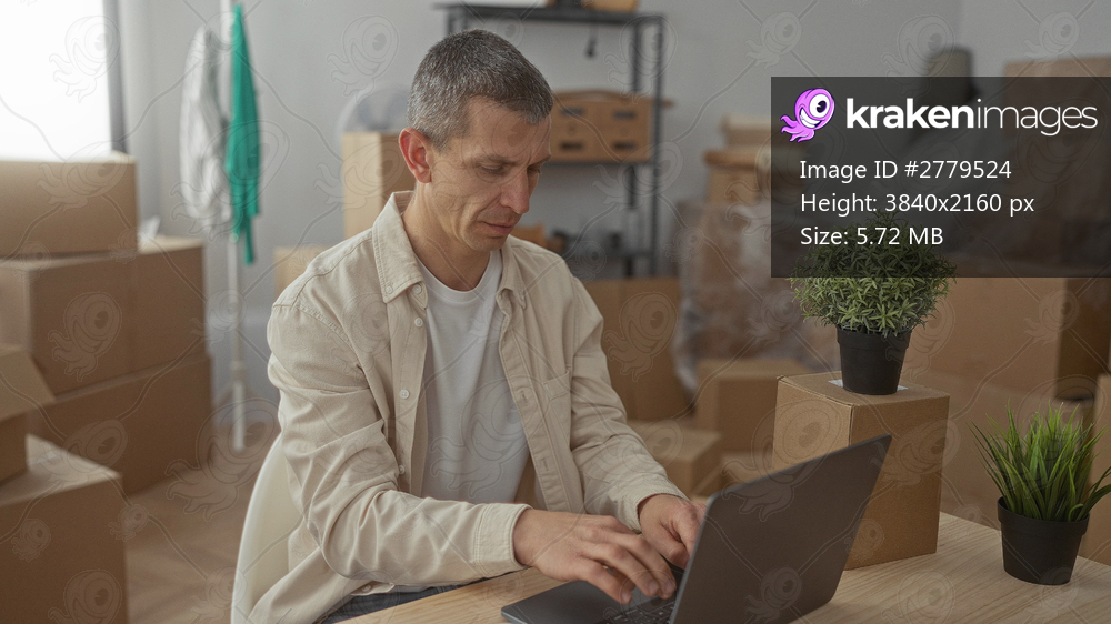 Man in casual attire working on laptop surrounded by cardboard boxes and plants in new apartment living room setting with natural light streaming in through windows. - Kraken Images