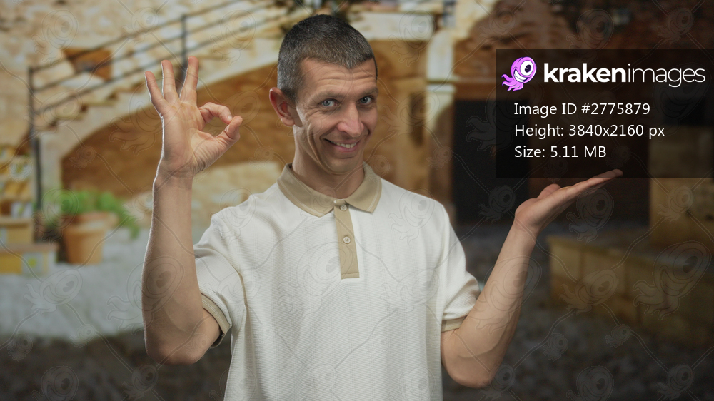 Man in casual shirt gestures outdoors against rustic stone background, implying approval or presentation, with hands pointing and making an ok sign.