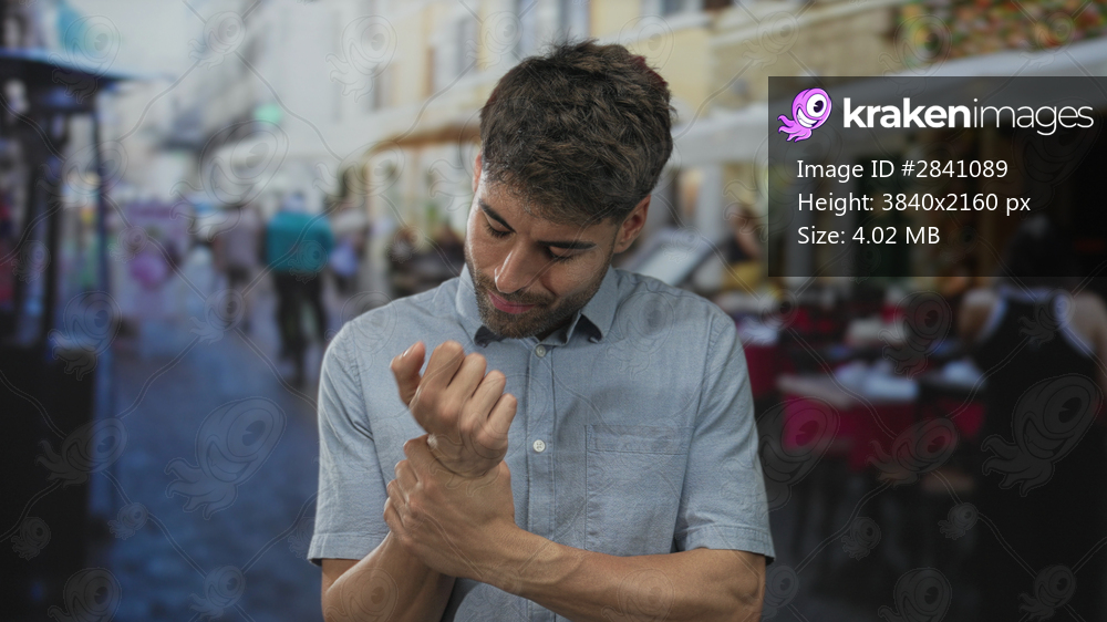 Man in casual shirt holds his wrist on street terrace among cafe tables; vulnerability introspection.