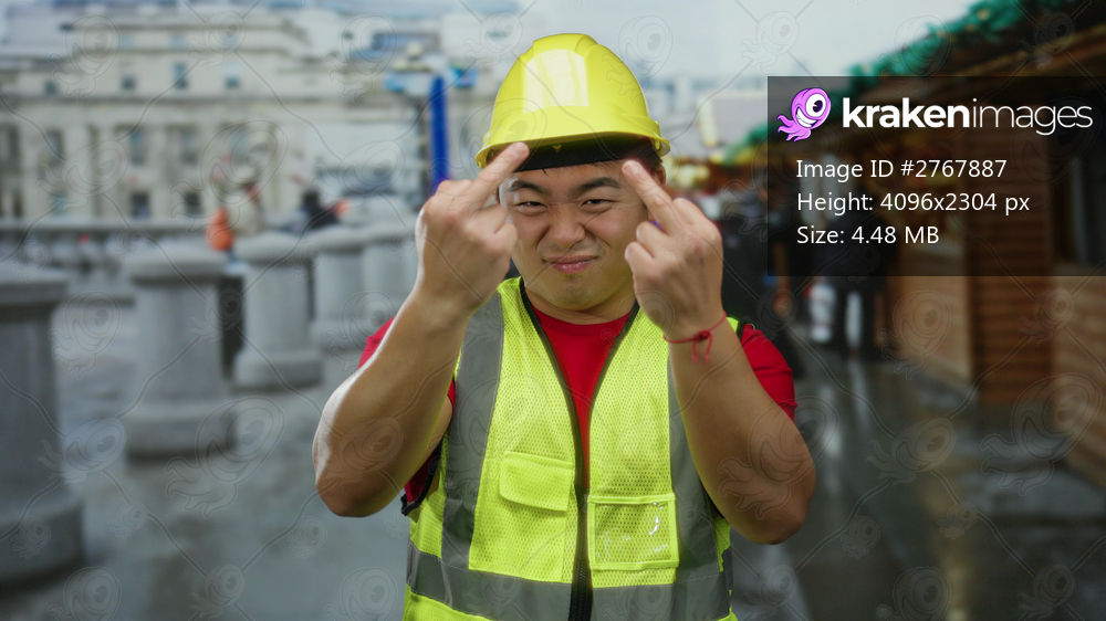 Man in city wearing safety vest and hardhat gesturing with both hands on rainy urban street with blurred buildings and market stalls in background.