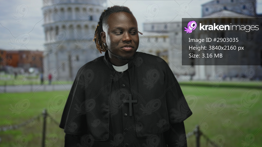 Man in clerical robes wearing a prominent cross necklace, finger to lips for silence in building at the leaning tower of pisa plaza; silence reflection. - Kraken Images