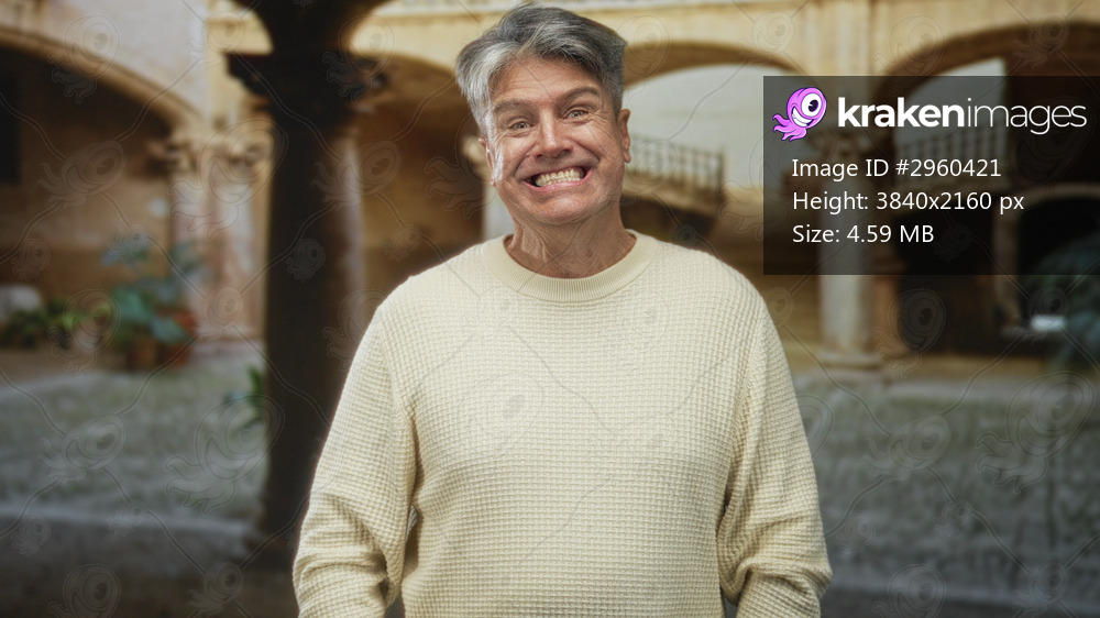 Man in cream sweater with gentle head tilt and hands in pockets, subtle smile standing in stone courtyard building; warm contentment.