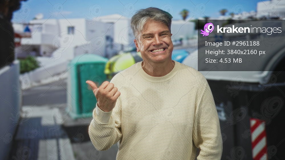 Man in cream sweater smiling and giving thumbs up beside large recycling bins on a residential street with white buildings; optimism friendliness.
