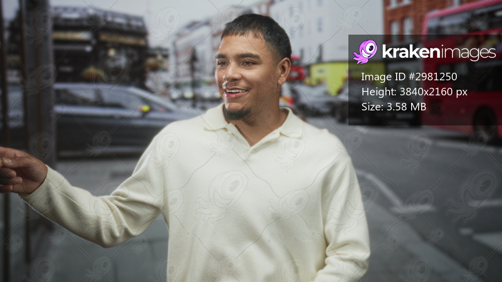 Man in cream sweater smiling and points finger toward a passing red double decker bus and cars on a busy street lined with shops and storefronts; curiosity. - Kraken Images