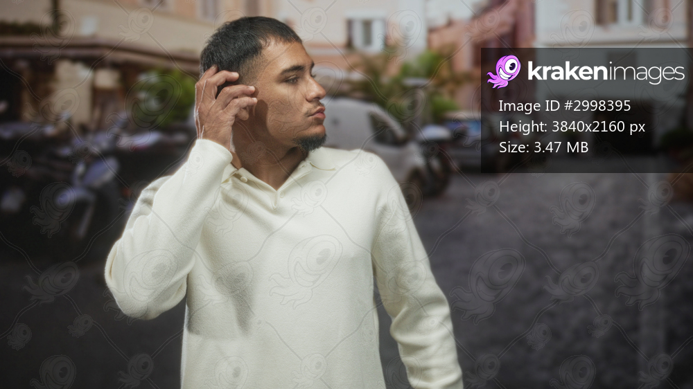 Man in cream sweater touching hair and looking sideways on a cobblestone street with parked scooters and cars; calm reflection.