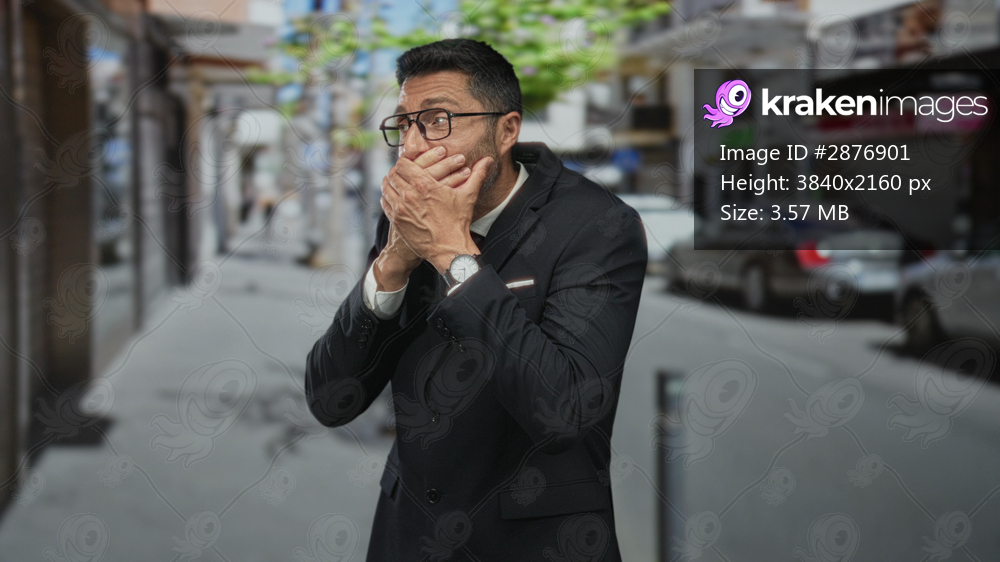 Man in dark suit and glasses wearing a wristwatch covers his mouth with both hands on a busy city street near parked cars; surprise concern.