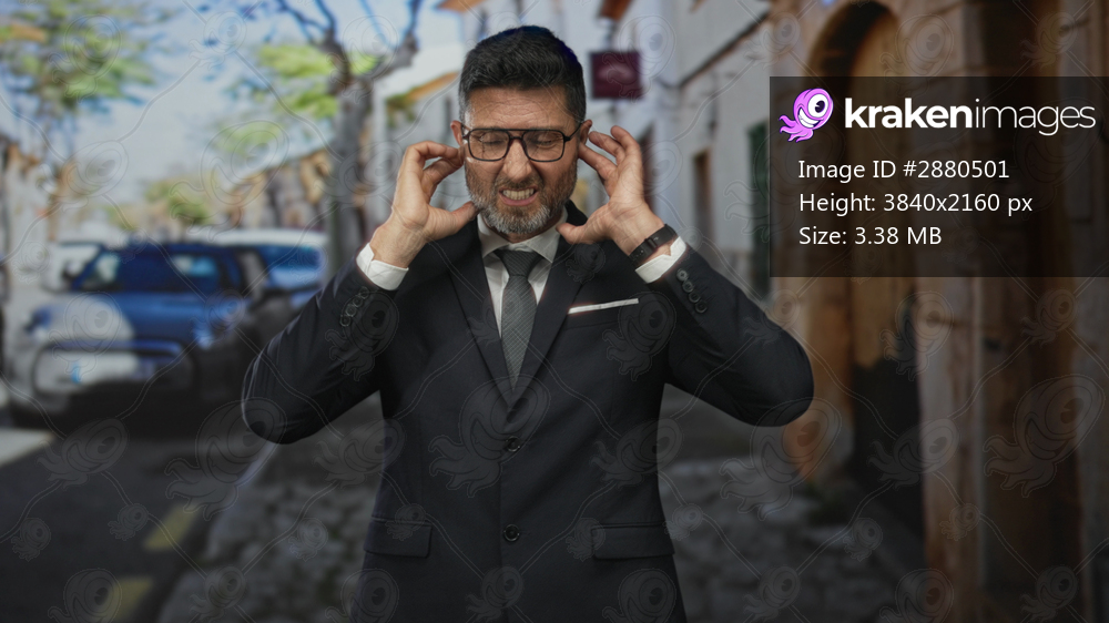 Man in dark suit pressing hands to ears on a narrow cobblestone street beside parked car and stone building; annoyance urban commute.