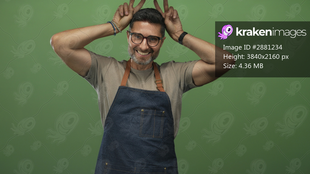 Man in denim apron making bunny ears with fingers against a green backdrop in studio; playful friendly warmth.