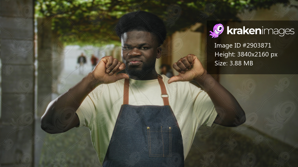 Man in denim apron points both thumbs at chest while grimacing on a stone street arcade; self judgement disapproval.