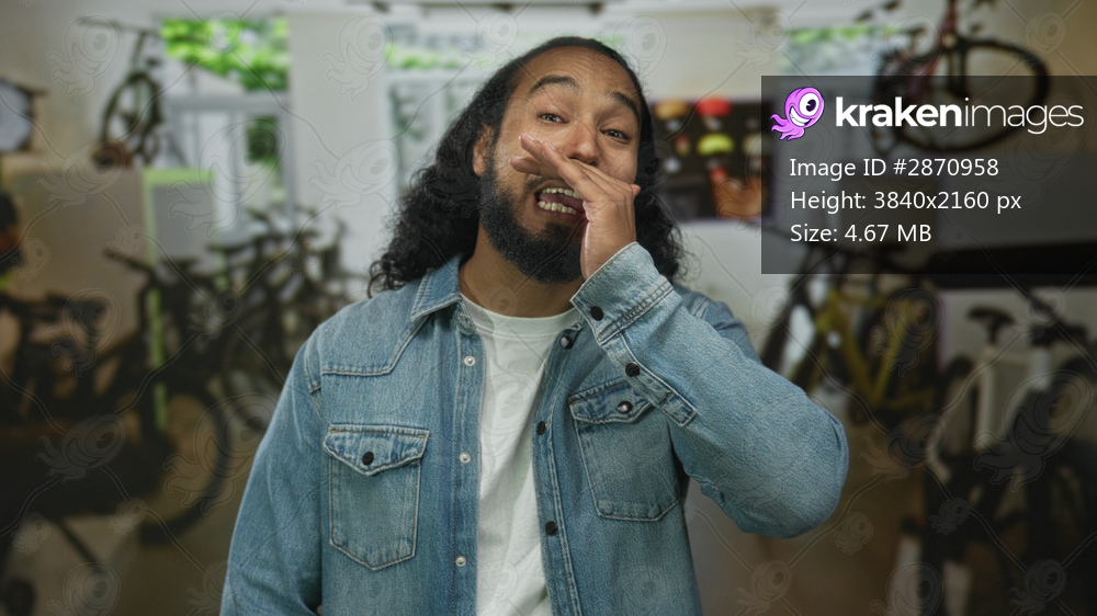 Man in denim jacket with fists in a boxing gesture and hand near mouth inside a bicycle shop building; playful confidence.