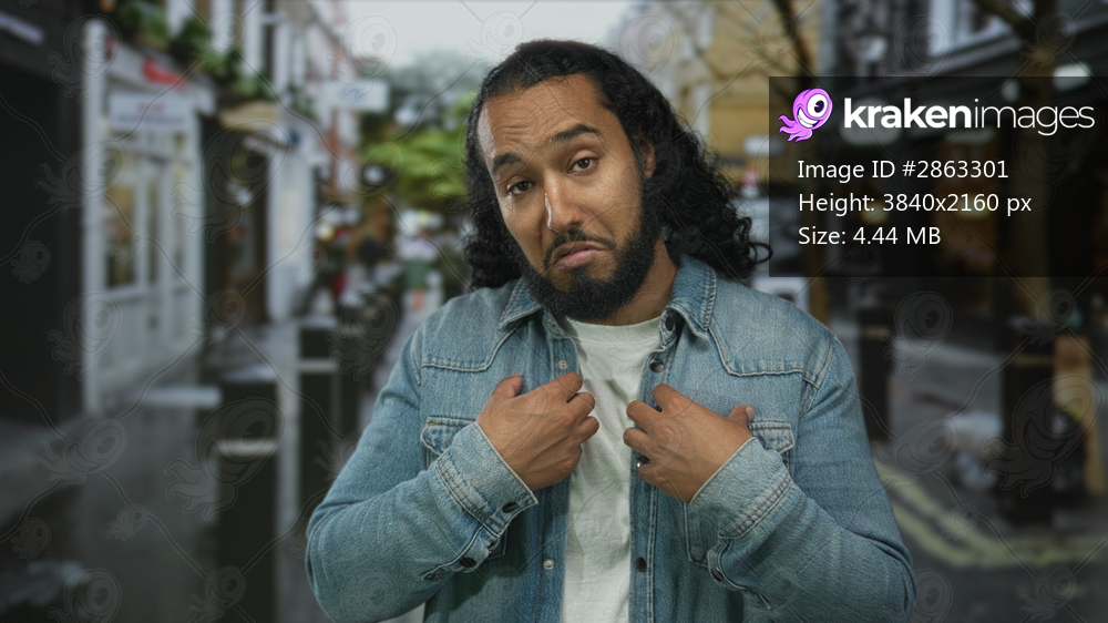 Man in denim jacket with hands adjusting collar and shrugging gesture on a city street; indifference casual attitude.